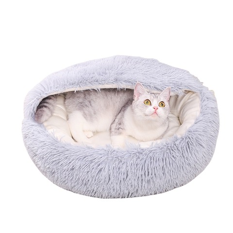 Venta al por mayor Linda cama redonda para gatos con cojín suave lavable de felpa y algodón para pequeñas mascotas de interior patrón sólido para el invierno
